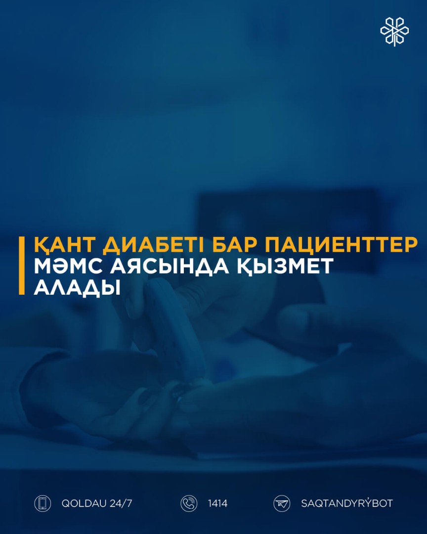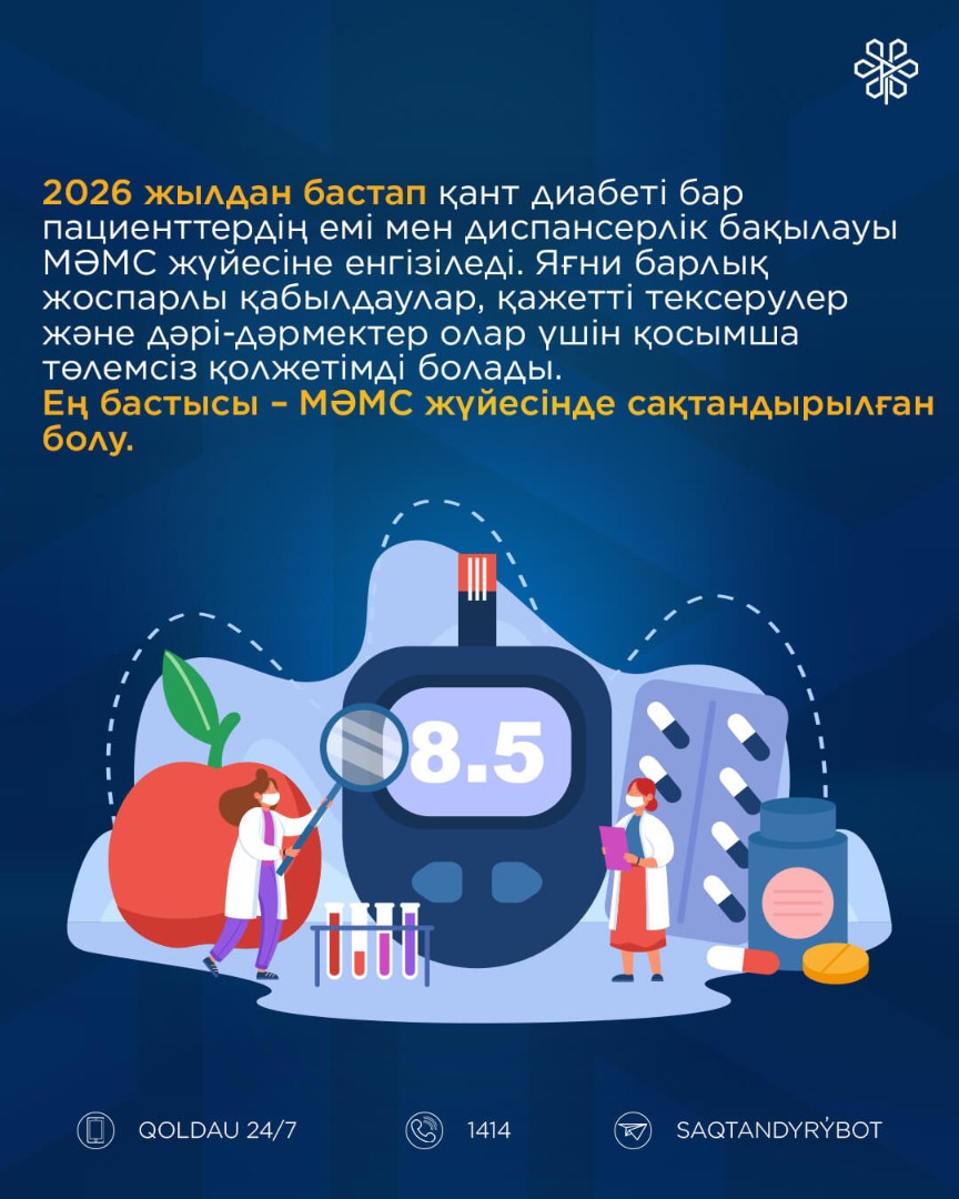 2026 жылдан бастап қант диабеті бар пациенттердің емі мен диспансерлік бақылауы МӘМС жүйесіне енгізіледі. Яғни барлық жоспарлы қабылдаулар, қажетті тексерулер және дәрі-дәрмектер олар үшін қосымша төлемсіз қолжетімді болады. Ең бастысы - МӘМС жүйесінде сақтандырылған болу.