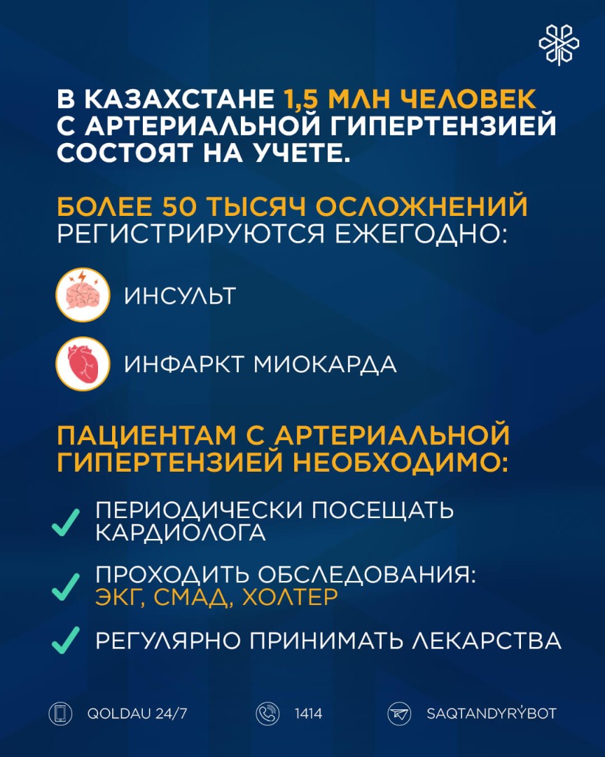 В Казахстане состоят на учете 1,5 млн человек с артериальной гипертензией. Ежегодно регистрируются более 50 тыс. осложнений этой болезни – инсульт, инфаркт миокарда.