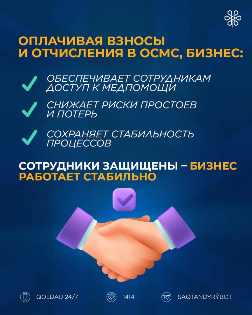 Оплачивая взносы и отчисления за своих сотрудников, вы обеспечиваете им доступ к медицинским услугам в системе ОСМС, а себя – стабильностью и сокращением рисков от сбоев и потерь.