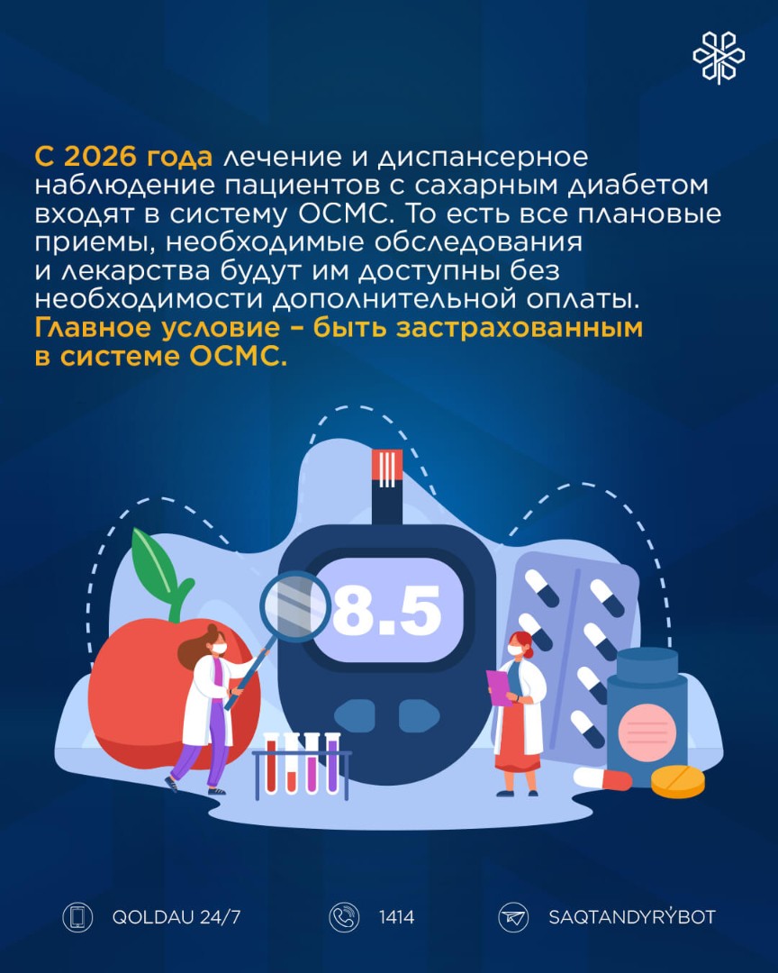 С 2026 года лечение и диспансерное наблюдение пациентов с сахарным диабетом входят в систему ОСМС. То есть все плановые приемы, необходимые обследования и лекарства будут им доступны без необходимости дополнительной оплаты. Главное условие – быть застрахованным в системе ОСМС.