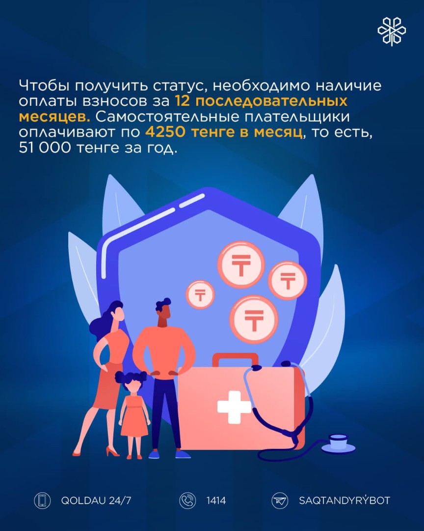 Чтобы получить статус, необходимо иметь наличие взносов за 12 последовательных месяцев. Самостоятельные плательщики оплачивают по 4250 тенге в месяц, то есть 51 000 тенге за год.