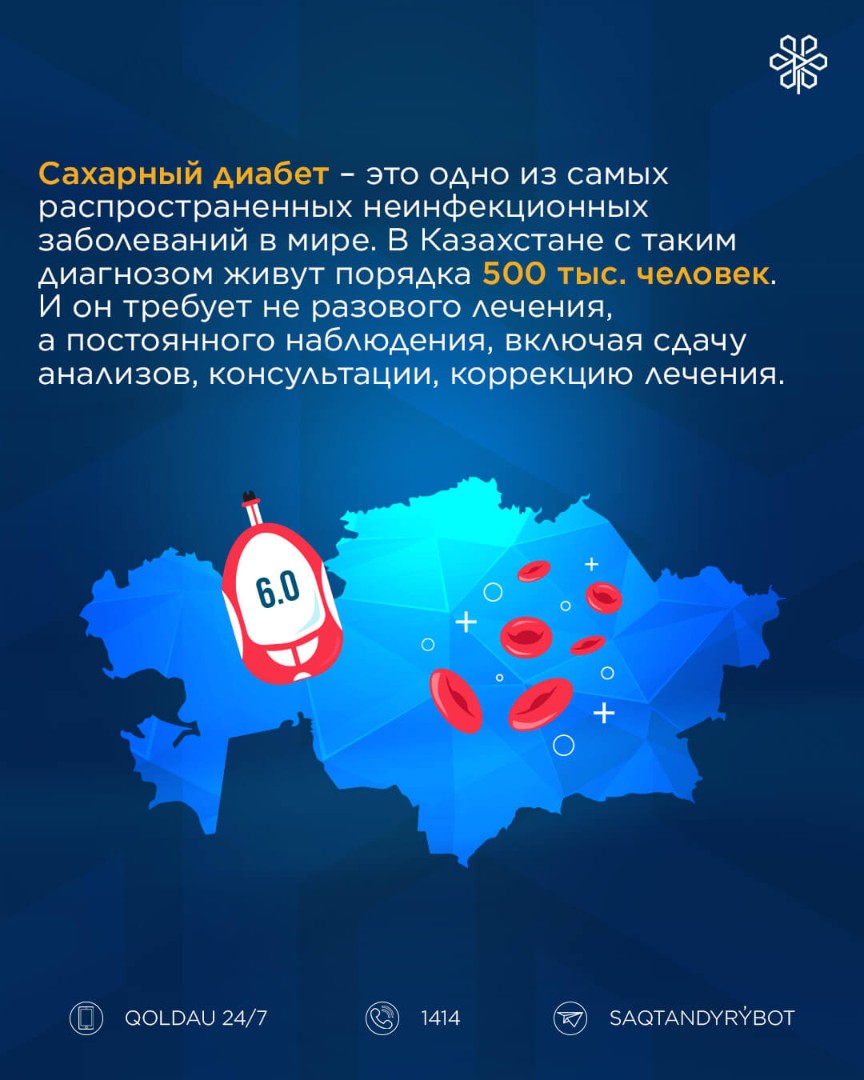 Сахарный диабет – это одно из самых распространенных неинфекционных заболеваний в мире. В Казахстане с таким диагнозом живут порядка 500 тыс. человек. И он требует не разового лечения, а постоянного наблюдения, включая сдачу анализов, консультации, коррекцию лечения.